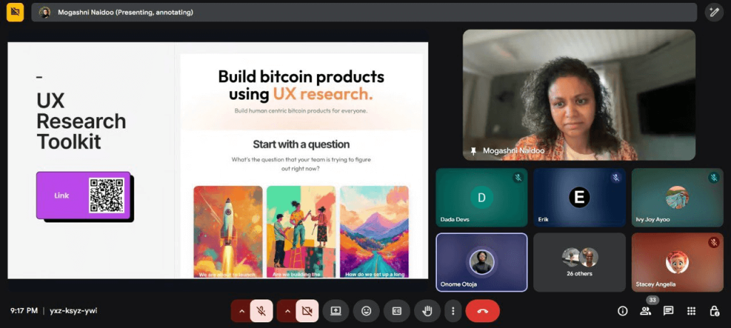The second session formed part of a broader partnership with the Bitcoin Design Foundation and took the form of a dedicated workshop on human-centered design for Bitcoin products. This session examined real interfaces and design patterns, helping participants understand how technical constraints—such as signing flows, recovery paths, and error handling—shape responsible design choices.